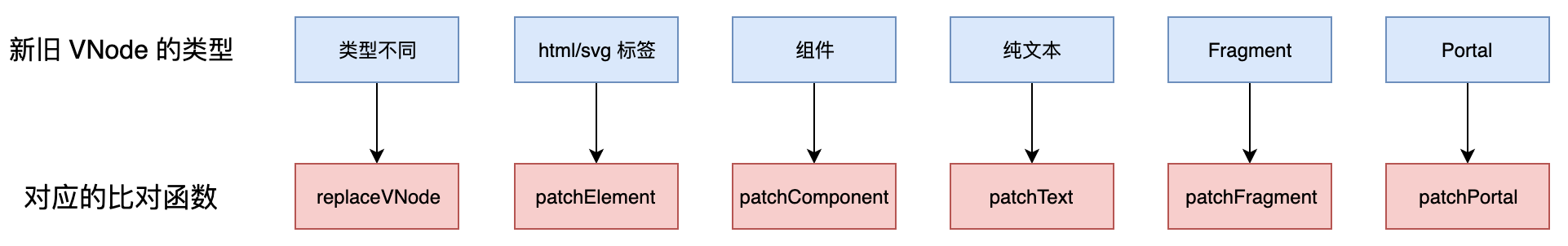 如上代码所示,既然 patch 函数的作用是用来比对新旧 VNode,那么 patch 函数必然需要接收新旧 VNode 作为参数,我们使用 prevVNode 形参代表旧的 VNode,使用 nextVNode 形参代表新的 VNode,如上是很清晰的一段比对逻辑,首先我们需要拿到新旧 VNode 的类型(flags),接着是一连串的 if...else if 语句,其核心原则是:如果类型不同,则直接调用 replaceVNode 函数使用新的 VNode 替换旧的 VNode,否则根据不同的类型调用与之相符的比对函数,如下图所示: