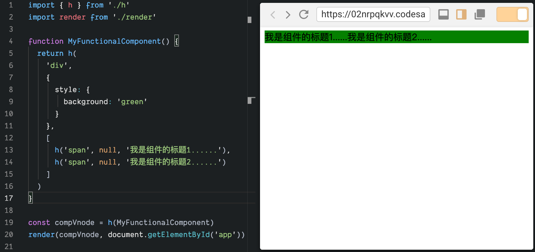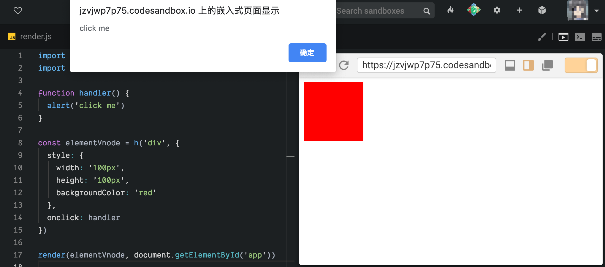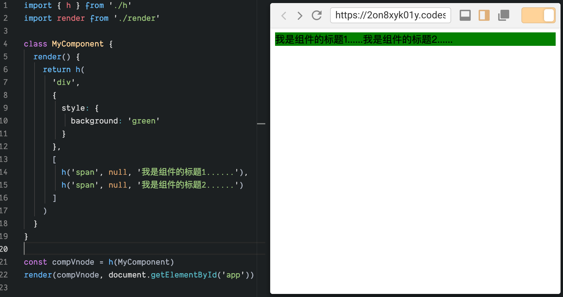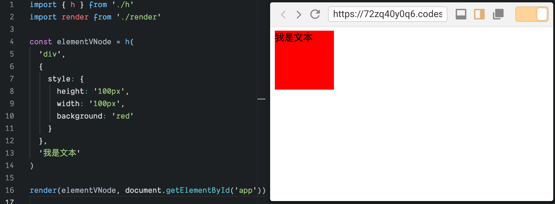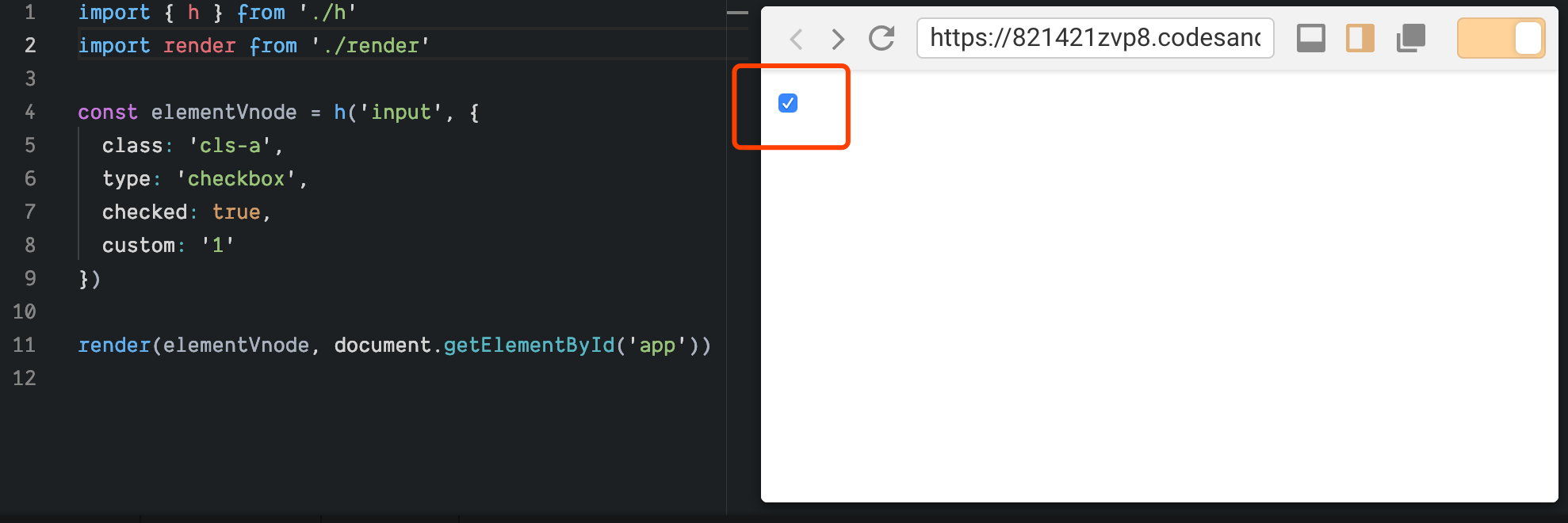为了测试我们的代码,我们修改 elementVNode 如下: