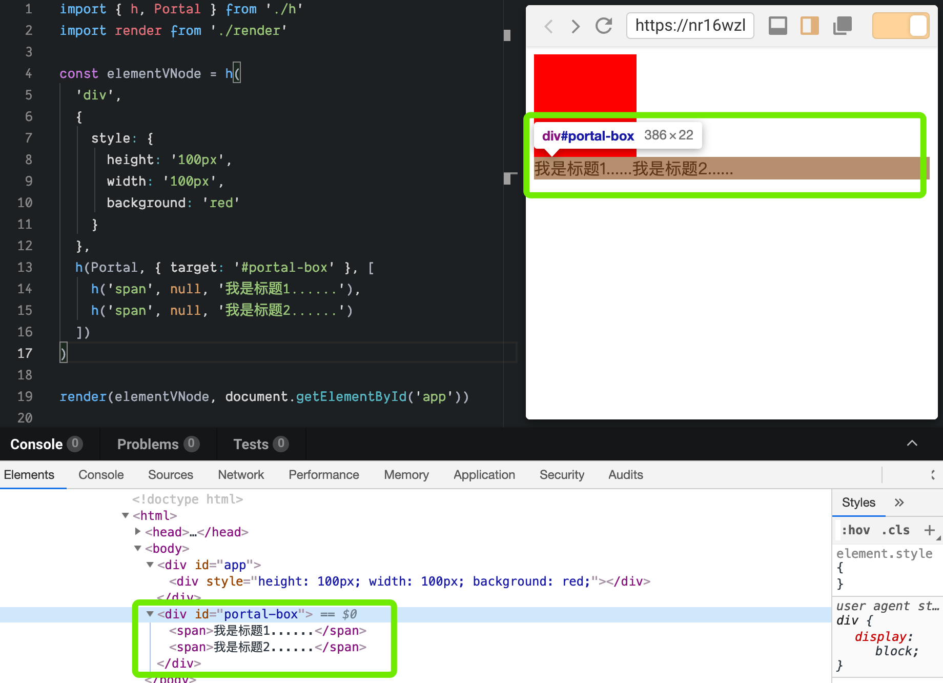 如上代码所示,挂载 Portal 的关键是我们需要通过 vnode.tag 获取到真正的挂载点,也就是 target,真正挂载时使用此挂载点代替 container 即可。